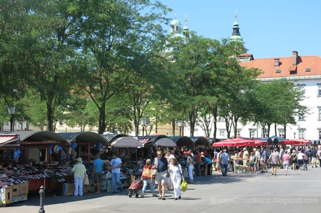 We zijn verrast door Ljubljana. Het blijkt een pittoreske, mooie en vooral een gezellige en overzichtelijke stad. Na een kopje koffie op het plein, wandelen we door de stad. Eerst naar het Prešeren plein, het centrale plein van de stad. Hier ligt het prachtige rode Franciscanenklooster en -kerk uit 1660. Er tegenover is de Drievoudige brug.